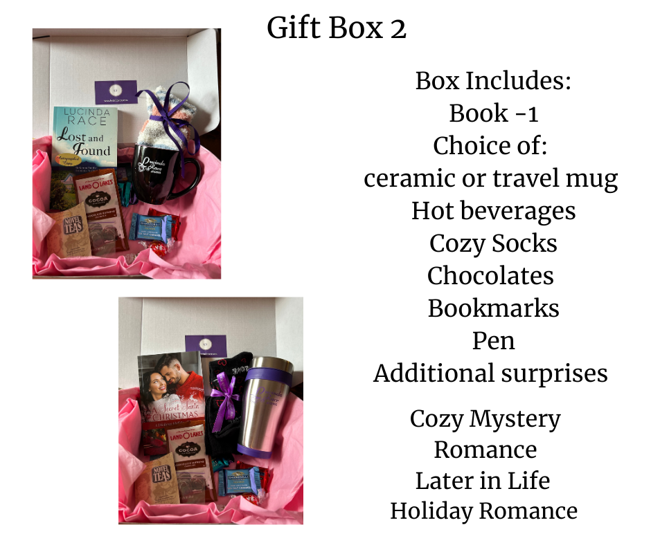 Personal, autographed by Lucinda Race, one book with a pair of cozy socks, a ceramic OR travel mug, bookmark, pen, beverage and sweet treats.